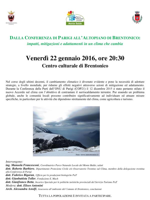 Nel corso degli ultimi decenni, il cambiamento climatico è divenuto evidente e pone la necessità di adottare strategie, a livello mondiale, per ridurne gli effetti negativi attraverso azioni di mitigazione ed adattamento. Durante la Conferenza delle Parti dell'ONU di Parigi (COP21) il 12 dicembre 2015 è stato pertanto stilato il nuovo Accordo sul clima con l'obiettivo di contrastare il surriscaldamento terrestre. Pur essendo un problema globale, anche le comunità locali possono contribuire significativamente ad individuare ed attuare misure specifiche, in particolare per le attività che dipendono strettamente dal clima, come agricoltura e turismo.