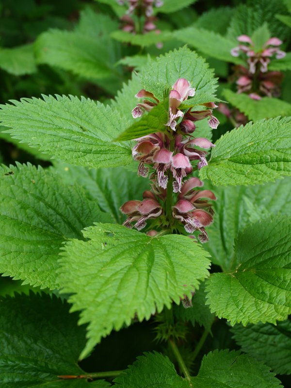 Lamio maggiore (Lamium orvala) - Famiglia Lamiacee. Questa pianta, alta anche 70 cm, assomiglia notevolmente all'ortica, sia per aspetto generale sia per la forma delle foglie, che hanno il margine seghettato. Per tale motivo viene anche chiamata "Falsa ortica". Il lamio maggiore ha però dei bei fiori di colore rosato che lo rendono inconfondibile. è piuttosto comune nei luoghi ombrosi e nei boschi fino a circa 1500 m di quota.