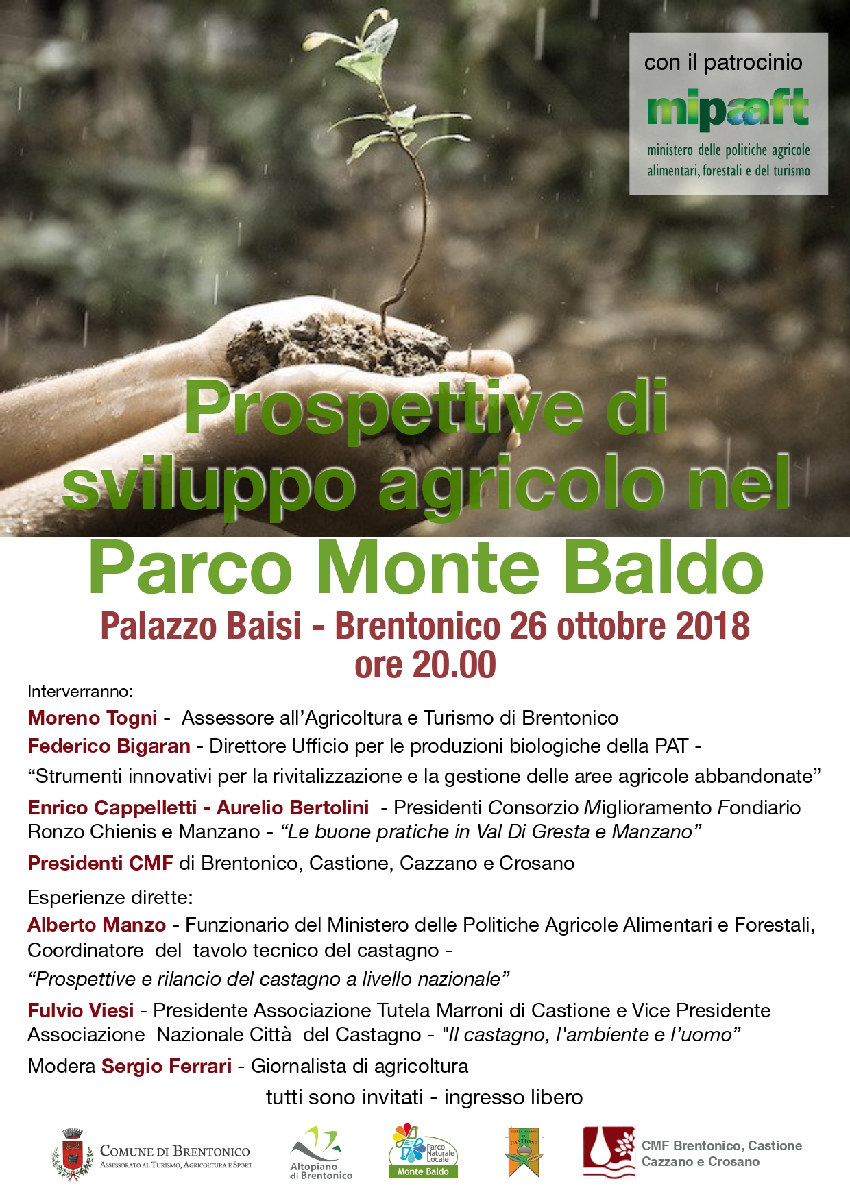 Hanno portato le proprie esperienze dirette: Alberto Manzo, funzionario del Ministero delle politiche agricole alimentari e forestali e coordinatore del tavolo tecnico del castagno con “Prospettive e rilancio del castagno a livello nazionale”; Fulvio Viesi, presidente associazione tutela marroni di Castione e vicepresidente dell’Associazione nazionale città del castagno con "Il castagno, l'ambiente e l’uomo”. Modera Sergio Ferrari, giornalista di agricoltura.