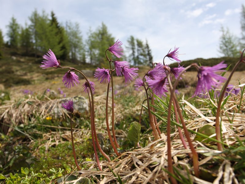 Soldanella alpina (Soldanella alpina) - Famiglia Primulacee - Pianta erbacea perenne esile, alta 5 - 15 cm, con fusticino incurvato in cima a sorreggere un solo fiore di colore azzurro violaceo. Il calice, con forma a campanula, presenta caratteristiche frange irregolari di 3 - 6 mm. Le foglie sono tutte alla base della pianta, tondeggianti. Cresce in montagna su prati e pascoli, nelle conche dove l'acqua di fusione della neve ristagna a lungo. Fiorisce tra maggio a luglio.