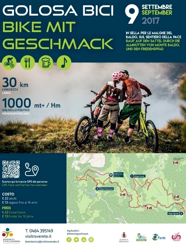 Scopri il Sentiero della Pace, con panorami da favola sul Monte Baldo. Il percorso di Golosabici è di media difficoltà, non competitivo: 30 km di lunghezza e 1000 metri di dislivello positivo. Non ti senti sufficientemente allenato? Affronta la giornata con unae-bike e l'itinerario sarà adatto anche a te! Sappi che per motivi organizzativi accettiamo iscrizioni fino a 300 persone e che la manifestazione si svolgerà con qualsiasi condizione meteorologica. Nelle malghe troverai un kit di assistenza bici e servizi igienici (nella prima e terza tappa).