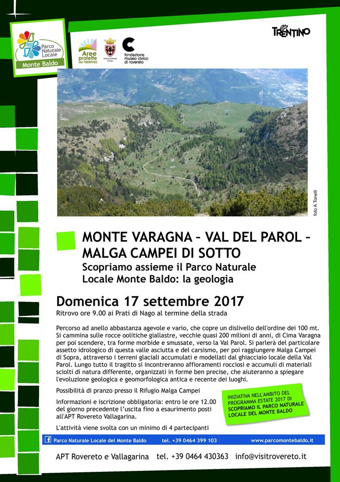 Si cammina sulle rocce oolitiche giallastre, vecchie quasi 200 milioni di anni, di Cima Varagna per poi scendere, tra le forme morbide e smussate, verso la Val Parol. Si parlerà del particolare assetto idrologico di questa valle asciutta e del carsismo, per poi raggiungere Malga Campei di Sopra, attraverso i terreni glaciali accumulati e modellati dal ghiacciaio locale della Val Parol.