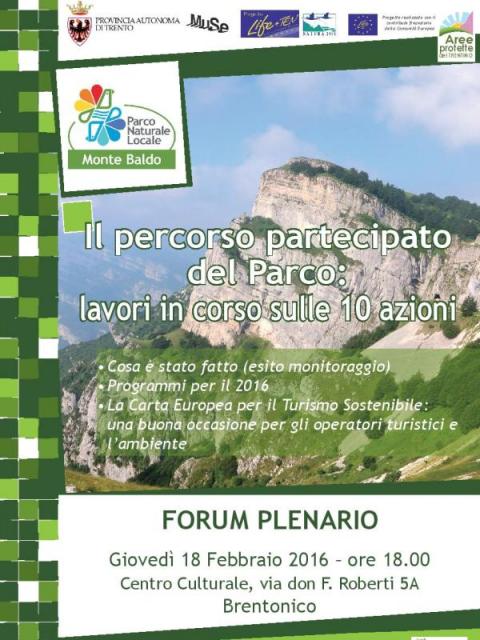 L'incontro avrà per oggetto la presentazione dei risultati del monitoraggio sullo stato di avanzamento delle azioni proposte nell'ambito del progetto LIFE+ TEN nel Parco Natulrale Locale Monte Baldo ed illustrerà le prospettive e gli impegni per il 2016 da mettere in atto a beneficio del turismo, dell'agricoltura e della natura.